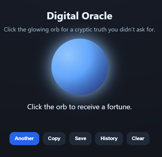 Click the glowing orb for cryptic truths you didn’t ask for. Save your prophecies, copy them, pretend they were about someone else. Suspiciously accurate. Unhelpfully soothing.